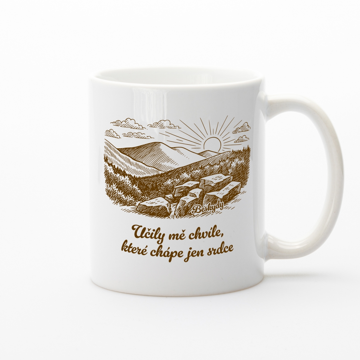 Na hrnku najdeš ruční kresbu beskydské krajiny v hnědých tónech. Skály v popředí, vzdušné louky, zaoblené kopce a slunce, které se pomalu zvedá za horizont — motiv je jemný, poetický a jako malá kapsa klidu, kterou si můžeš vzít všude s sebou. Citát doplňuje atmosféru, podporuje zamyšlení a působí jako malý okamžitý návrat do míst, která učí trpělivosti i radosti.
