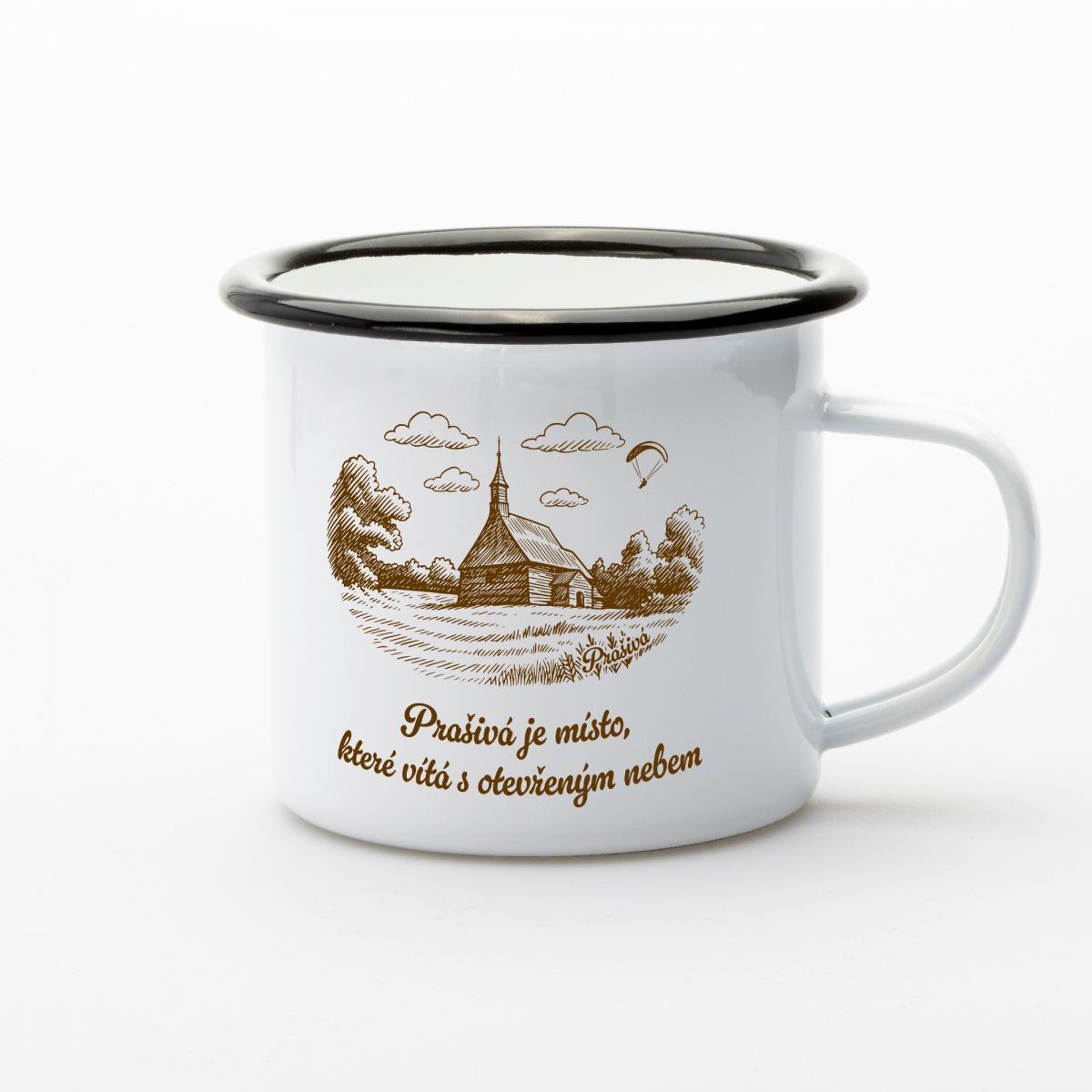 Na bílém smaltovaném těle najdeš ručně kreslenou hnědou ilustraci dřevěného kostelíku na Prašivé, obklopeného stromy a beskydskou krajinou. Nechybí ani paraglidista v oblacích – přesně tak, jak to k Prašivé patří. Motiv působí jako malá letní vzpomínka na odpoledne, kdy jsi seděl na trávě, díval se do dálky a věděl, že svět je v tu chvíli přesně takový, jaký má být.