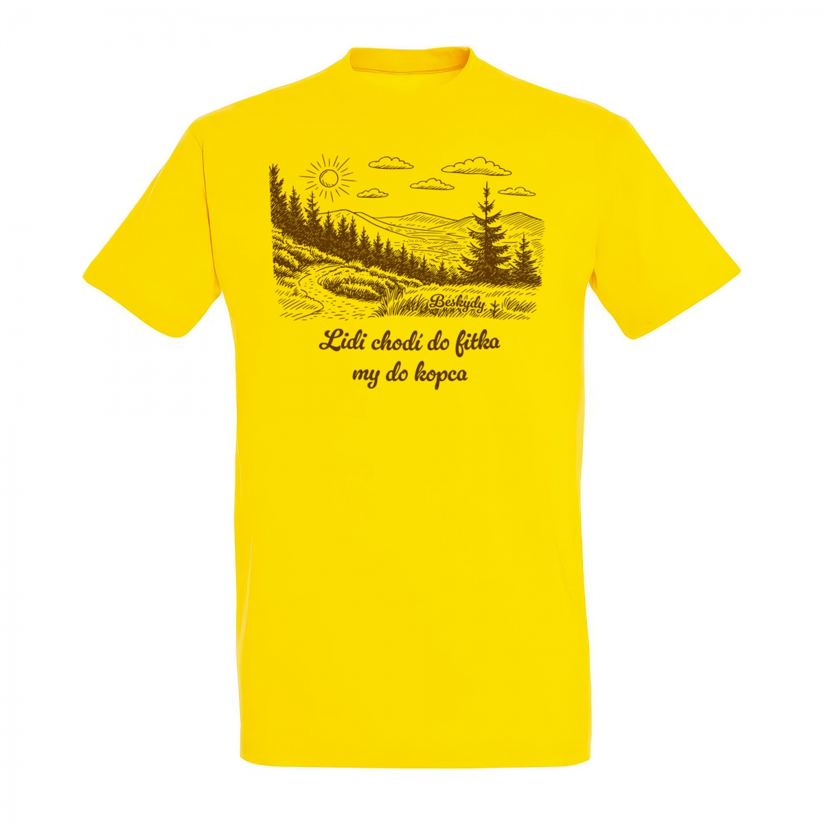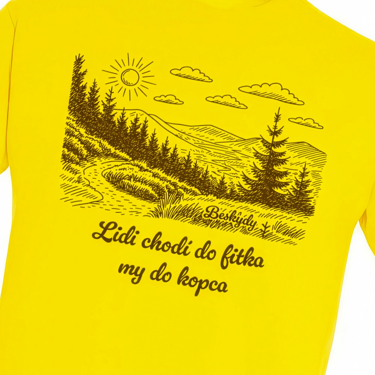 Někdo chodí do fitka. A někdo… do kopca. A přesně pro tu druhou skupinu vzniklo tohle tričko – jasně žluté jako slunce nad beskydskými loukami a s ilustrací, která v sobě nese klid i volnost horských cest.