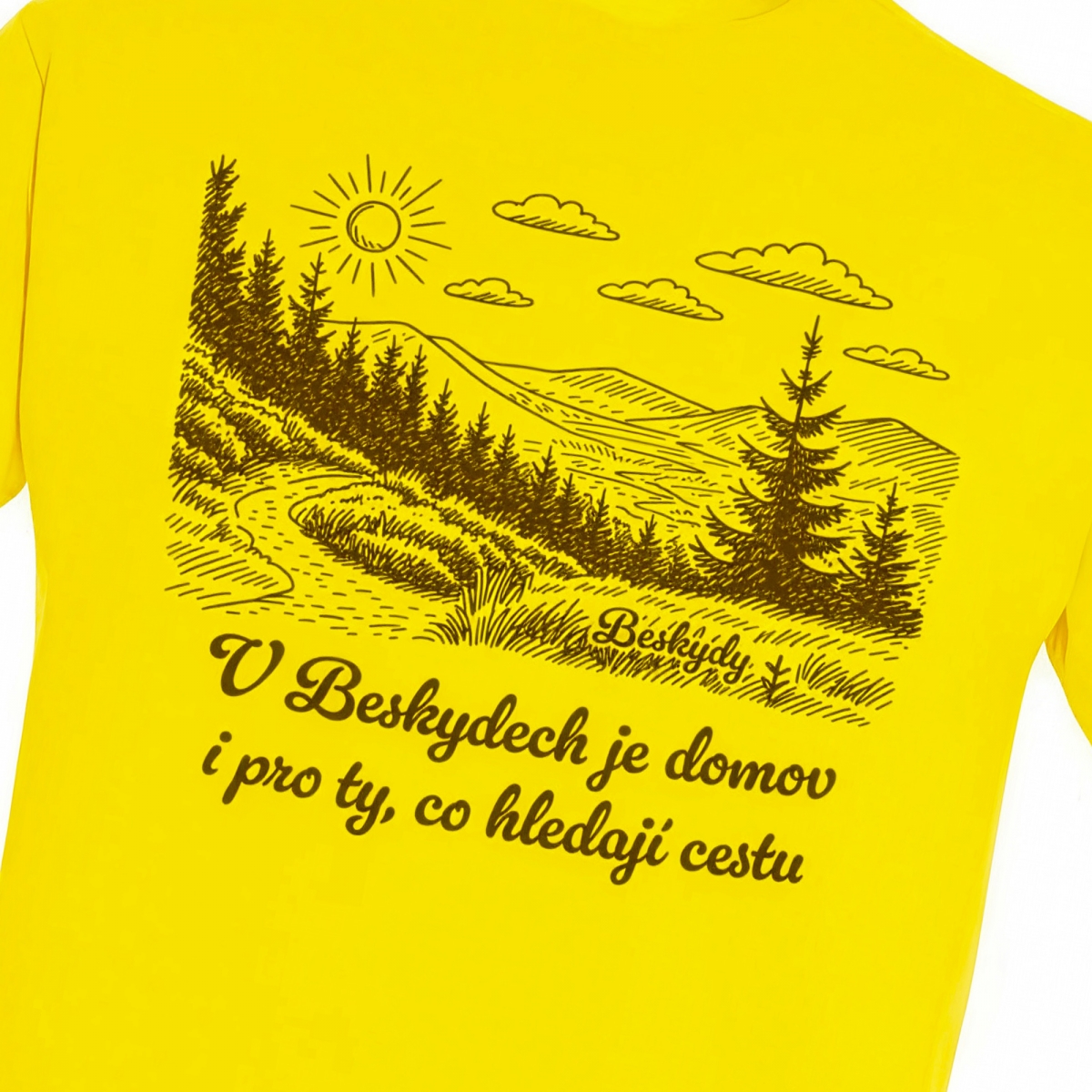 Tohle tričko není jen o barvě – je o pocitu, který ti Beskydy nechají v srdci. Sytě žlutý odstín připomíná ranní slunce nad hřebeny a teplo, které se dotýká stezky, když se vydáš vzhůru. Nese na sobě originální ruční kresbu beskydské krajiny v jemně hnědé linii, která působí teple, ručně, poctivě – tak, jako samotné hory.